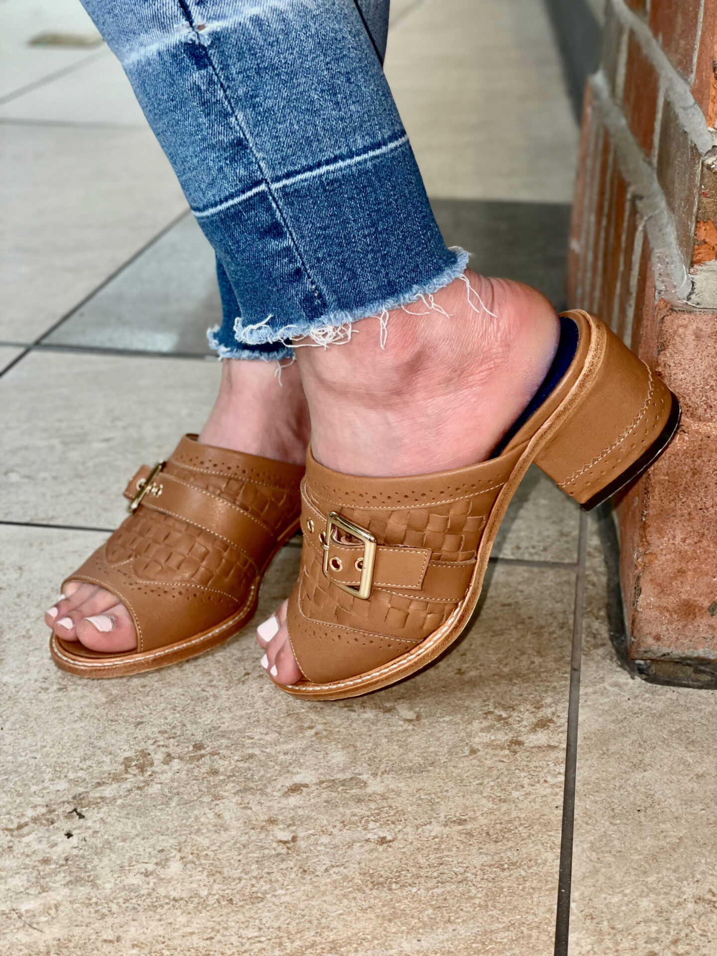 The Cadence Mule Low Heel Sandal is meticulously crafted with intricate brogue detailing that showcases the fine artistry involved in its creation. The woven uppers add a unique texture to the shoe, making it stand out in a crowd. The straps, adorned with golden eyelets, add a dash of glamour to the overall design. The classic functional gold buckle not only ensures a perfect fit but also adds an extra layer of sophistication to these sandals.